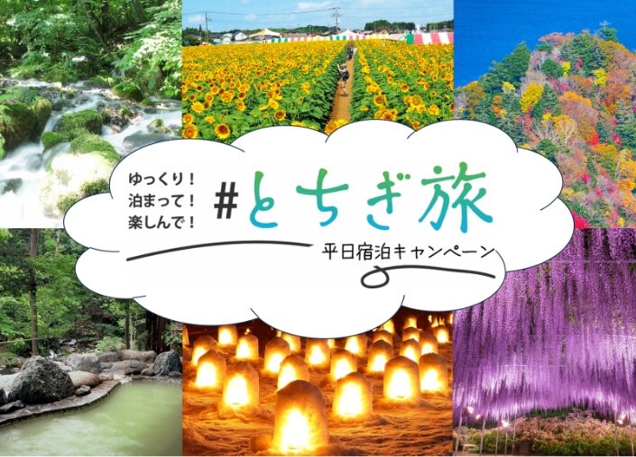 Home お知らせ, ブログ とちぎ旅 冬の平日宿泊キャンペーン第2弾スタート! とちぎ旅 冬の平日宿泊キャンペーン第2弾スタート! 2025.12.1 お知らせ、ブログ 栃木県にて第2弾として「とちぎ旅平日宿泊キャンペーン」を実施中です。下記期間中に栃木県内の旅館・ホテルに宿泊し、キャンペーンに応募すると抽選で計225名様に、とちぎ旅行で使える最大10万円分の宿泊クーポンやWチャンスとして栃木県産のいちごなどの賞品が当たるチャンスも!この機会にぜひ、冬のとちぎ旅をお楽しみくださいませ。【対象宿泊期間】2025年12月1日~2026年2月27日チェックイン分(※12月27日~1月3日、1月11日、2月22日チェックイン分を除く)詳細はこちら→とちぎ旅冬の平日宿泊キャンペーン | ゆっくり!泊まって!楽しんで! Tweet Share +1 Hatena RSS Pin it
